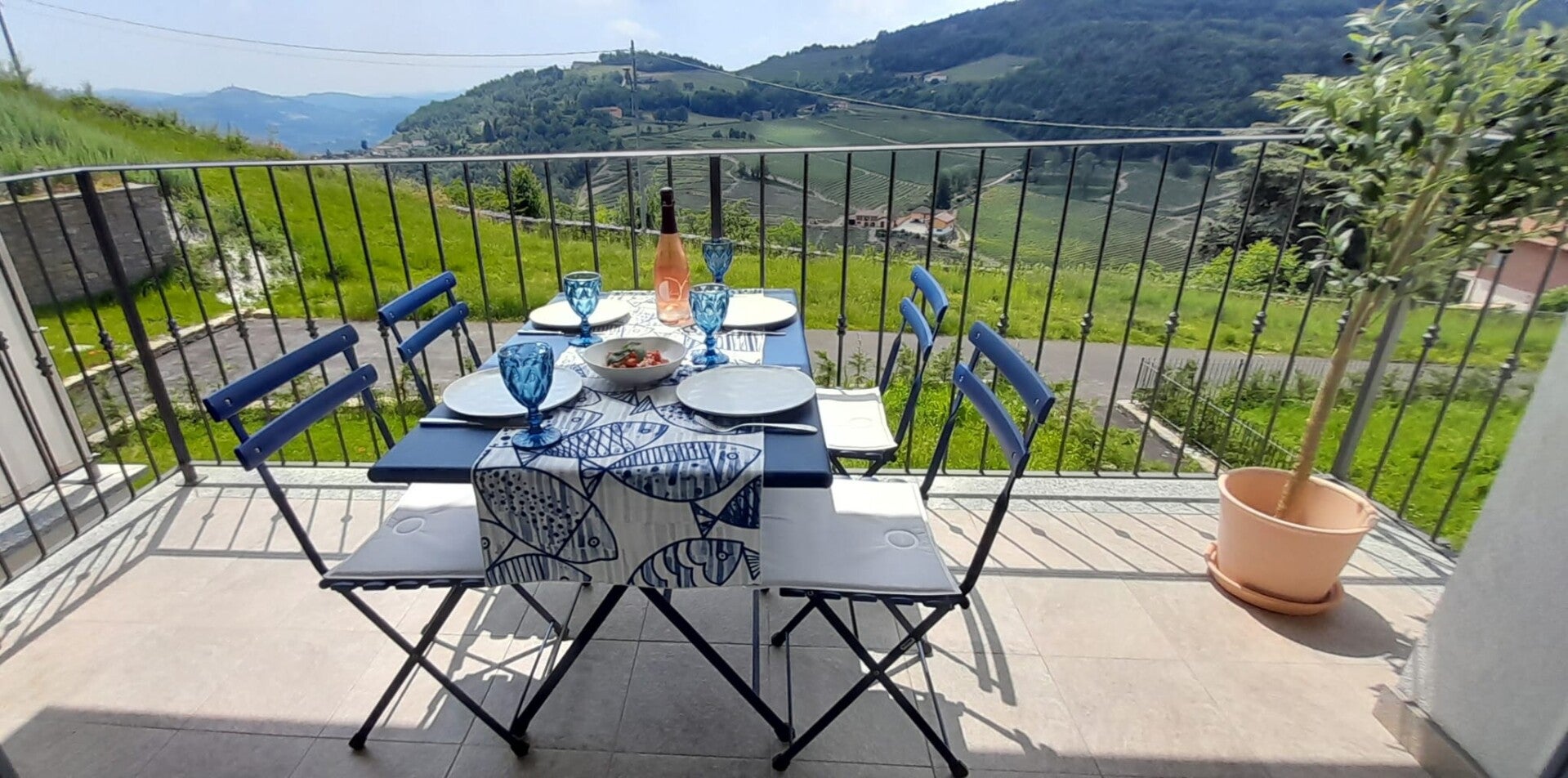 Het balkon biedt uitzicht op het omliggende landschap en is een fijne plek om ’s ochtends koffie te drinken of ’s avonds te genieten van de rust.
